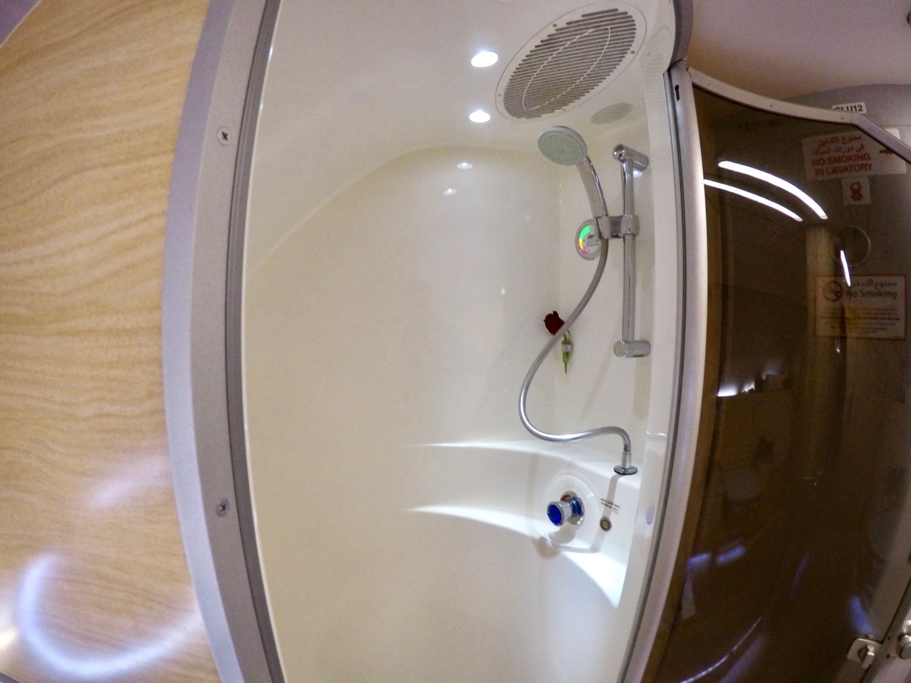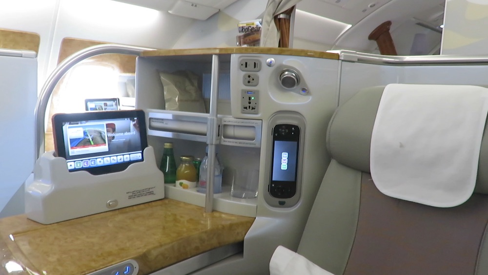 The Emirates Airbus 380-800 includes 14 First Class suites, including an on-board shower.All is really elegant, with plenty of touches of gold, new orchids, and a tray of snacks ready for the travelers to sit down. A further great feature of pre-take is the offer of Arabic coffee and dates.