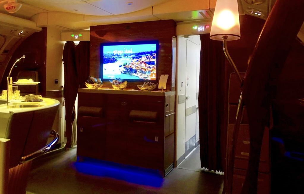The newly delivered aircraft includes luxury suites, two washrooms complete with showers, and a spa. The first class also allows you keys to the lounge and bar room for business classes. The lounge is beautiful and comfortable for both business and first-class passengers — it hardly looked like it was on an aircraft.