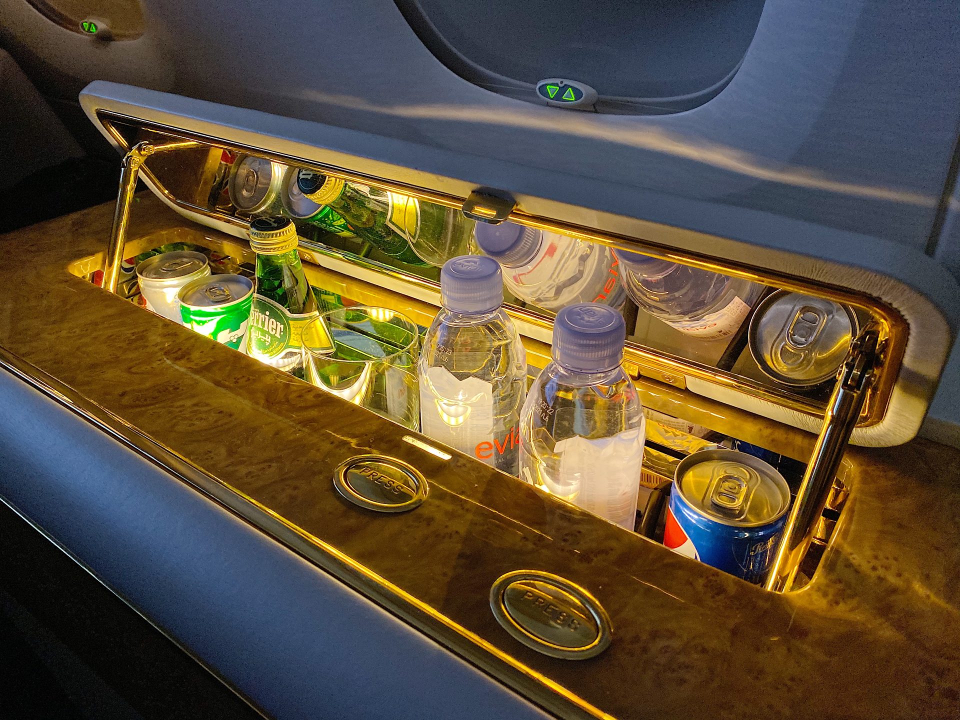 The Boeing 777 introduced the Emirates First Class Cabin in 2017. The virtual windows that project live feed from the outside of the aircraft in real-time are available on the middle suite. There are two minibars placed on the side of the entertainment screen. A 13-inch tablet with a front camera makes it possible to communicate with the cabin crew and to order room service.