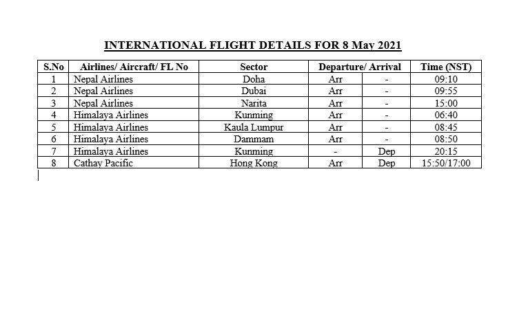 As per the AviationNepal source, The international chartered and regular flights from Tribhuvan International Airport, Kathmandu on 08 May 2021 are as described. The carriers involved might adjust the timing mentioned below. For exact dates and times, immediately ask the travel agencies / concerned airlines. The data below is for informational purposes only.