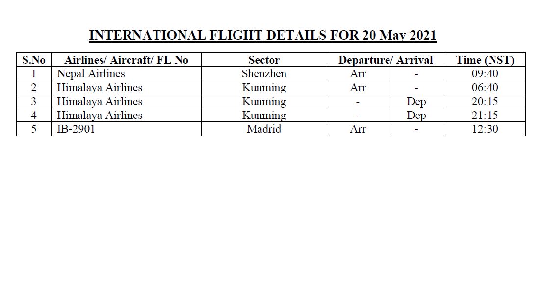 As per the AviationNepal source, The international chartered and regular flights from Tribhuvan International Airport, Kathmandu on 20 May 2021 are as described. The carriers involved might adjust the timing mentioned below. For exact dates and times, immediately ask the travel agencies / concerned airlines. The data below is for informational purposes only.