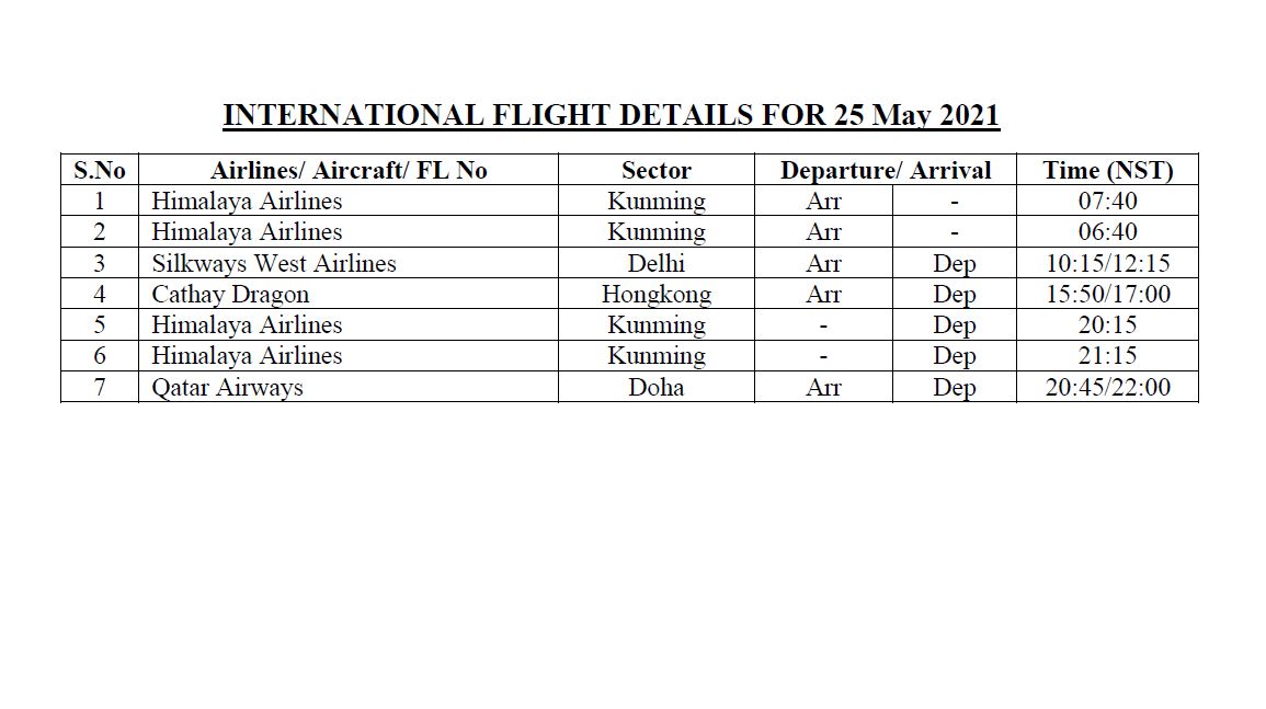 As per the AviationNepal source, The international chartered and regular flights from Tribhuvan International Airport, Kathmandu on 25 May 2021 are as described. The carriers involved might adjust the timing mentioned below. For exact dates and times, immediately ask the travel agencies / concerned airlines. The data below is for informational purposes only.