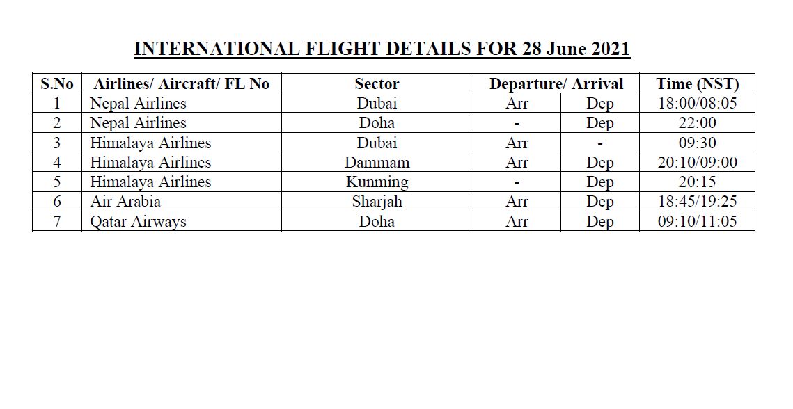 As per the AviationNepal source, The international chartered and regular flights from Tribhuvan International Airport, Kathmandu on 28 June 2021 are as described. The carriers involved might adjust the timing mentioned below. For exact dates and times, immediately ask the travel agencies / concerned airlines. The data below is for informational purposes only.