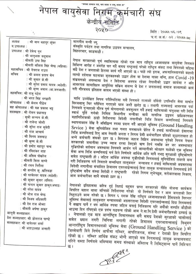 The memorandum was passed over to Tourism Minister Yogesh Bhattarai by the Nepal Airlines Company Workers Association (Closed to Nepali congress). The traitorous action was ordered to be withdrawn. The proposal to hand over the Himalayas was strongly objected. Finally, on Sunday, Minister Bhattarai convened Rajan Pokharel, Director General of the Civil Aviation Authority, and ordered him not to follow Himalaya Airlines’ decision to comply with self-ground handling.