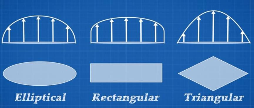 Here are some wing shapes and their lift distribution to see how this works and let us compare them. In the figure below, three wing shapes and their lift distribution are shown: an elliptical, rectangular and triangular wings.