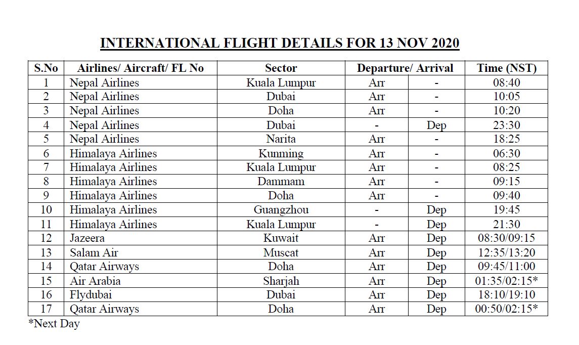 As per the AviationNepal source, The international chartered and regular flights from Tribhuvan International Airport, Kathmandu on 13 November 2020 are as described. The carriers involved might adjust the timing mentioned below. For exact dates and times, immediately ask the travel agencies / concerned airlines. The data below is for informational purposes only.