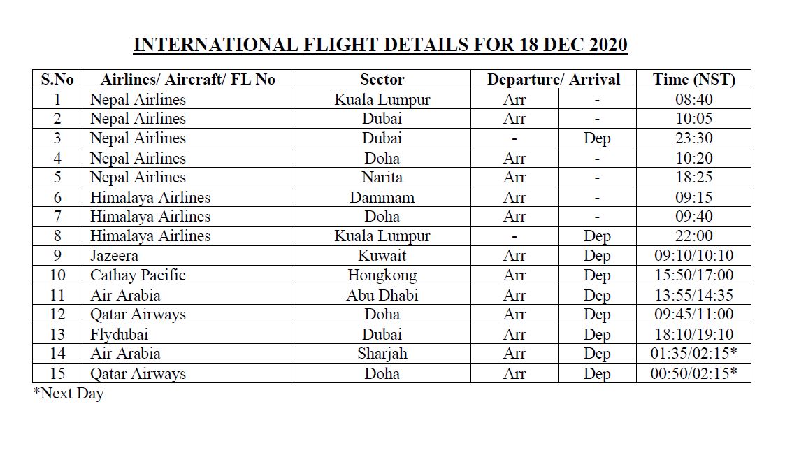 As per the AviationNepal source, The international chartered and regular flights from Tribhuvan International Airport, Kathmandu on 18 December 2020 are as described. The carriers involved might adjust the timing mentioned below. For exact dates and times, immediately ask the travel agencies / concerned airlines. The data below is for informational purposes only.