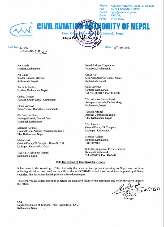 Civil aviation authority of Nepal (CAAN) has issued a letter to all the International Airlines operating in Nepal for the refund of the un-utilized Air tickets.