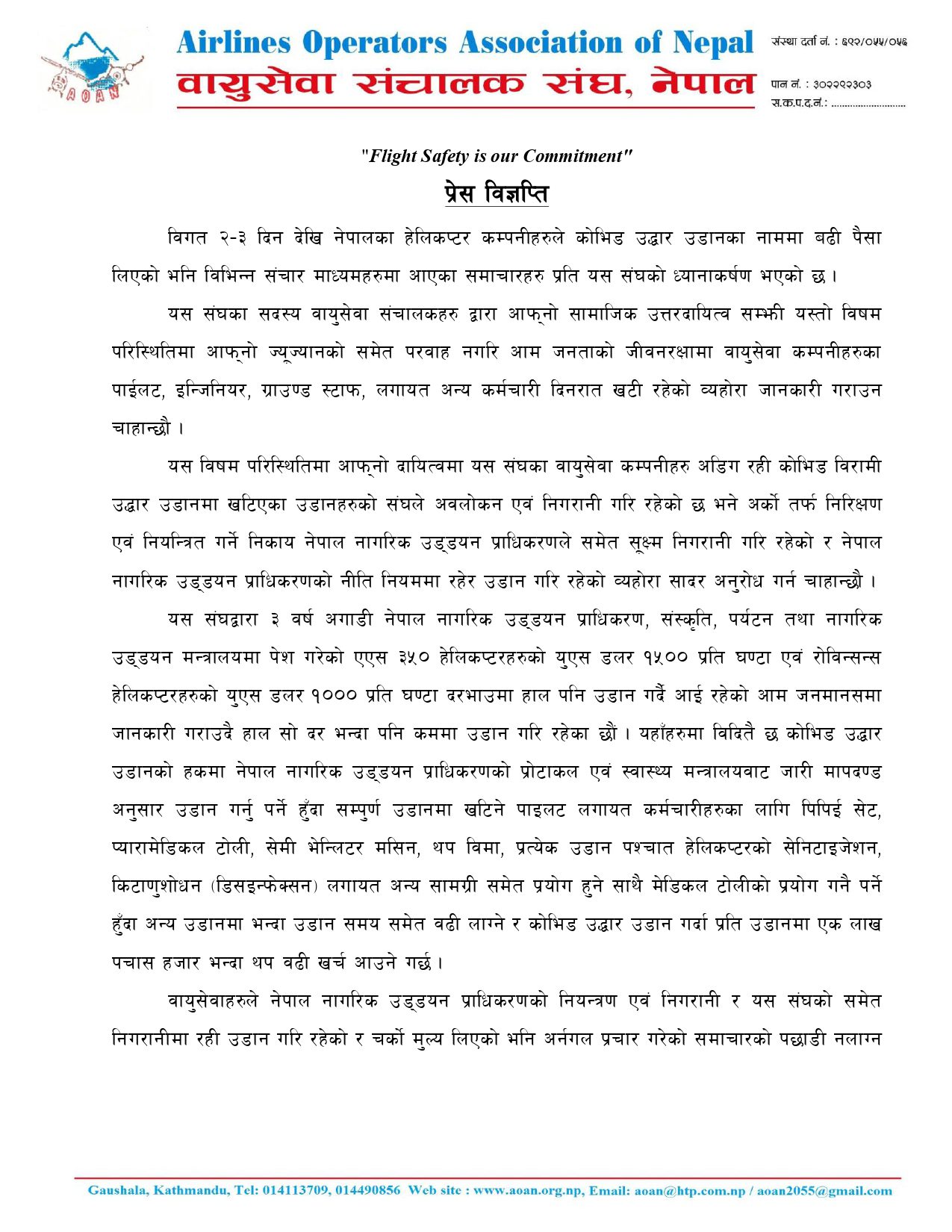 The Airlines Operators Association of Nepal has issued a press release today regarding the COVID patient’s chartered flight.