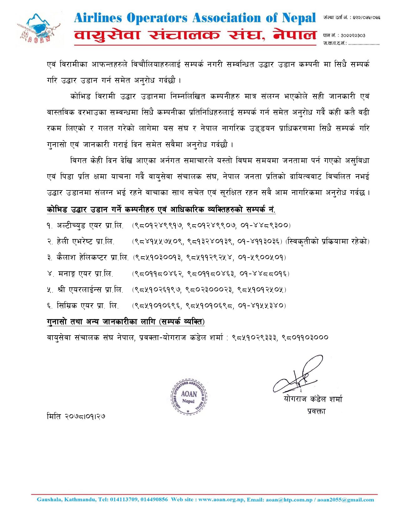 The association has also requested the concerned class to contact the concerned airline directly without getting the intermediary if a helicopter is needed for the rescue. The association has also requested to contact the association and CAAN if it has taken more money.
