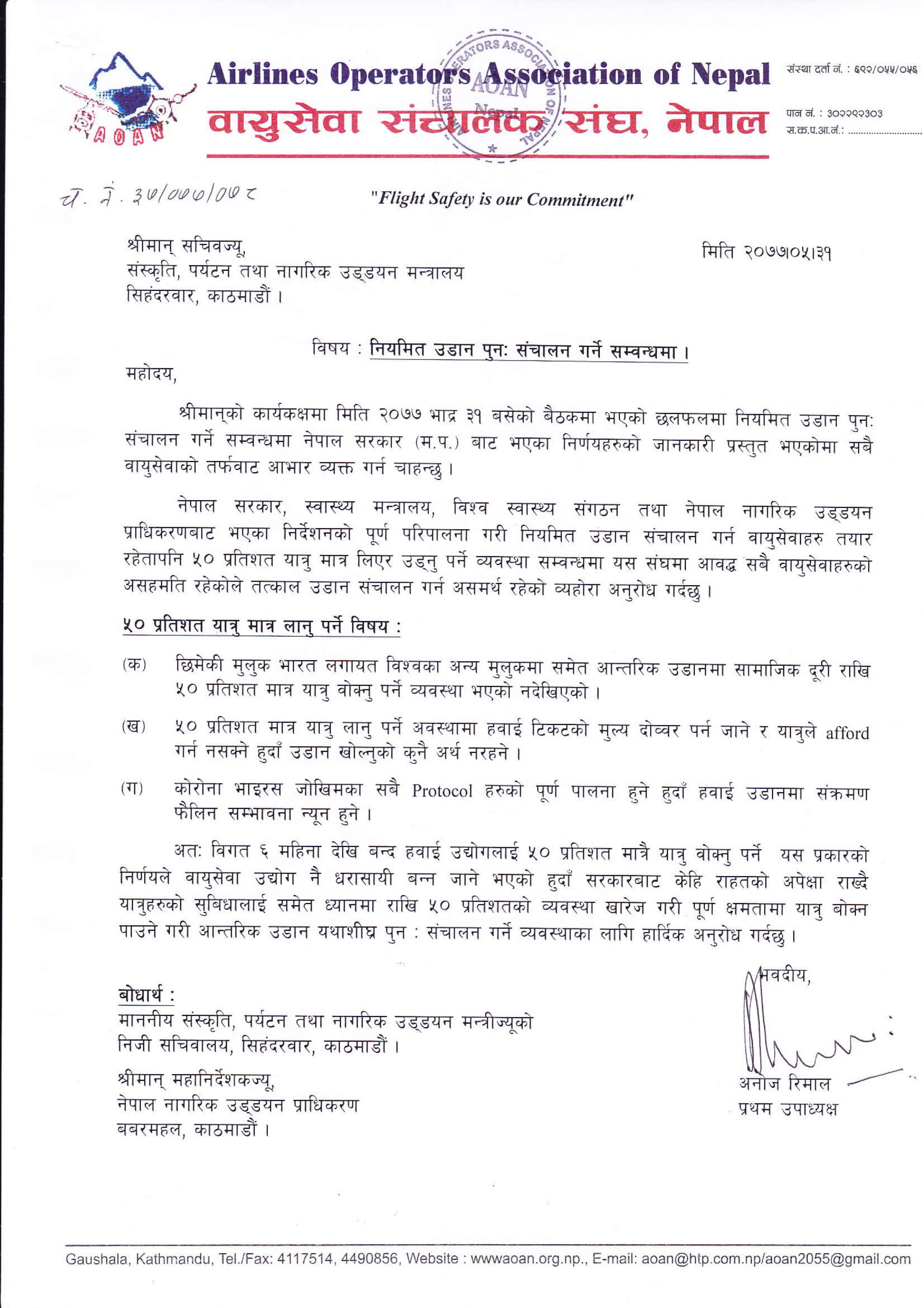 AOAN request the Ministry to eliminate the 50 percent occupancy on domestic flights