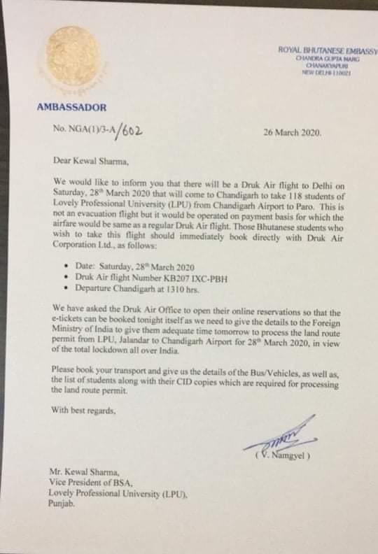 The Druk Air flight, A5-JKW Airbus A320 landed yesterday (28 March 2020) at the Paro International Airport with Bhutanese students studying in Lovely Professional University in Punjab, India. They boarded the flight from Chandigarh. It was not an evacuation flight but it was operated on payment basis for which the airfare was same as a regular Druk Air Flight. “Chandigarh International Airport Limited provided all possible help in the smooth operation of a Druk Air special flight on March 28, from Chandigarh to Paro in Bhutan,” an airport official.