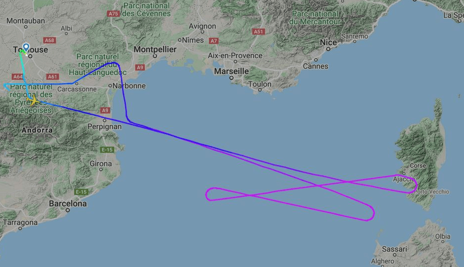 The Airbus aircraft with the temporary alias F-WWKQ took off from Toulouse at 12:52 UTC; the flight AIB01KQ lasted for about 3 hours and 20 minutes on the air over the Mediterranean Sea towards Corsica. The pilots did a long series of aircraft tests up to the altitude of 41,00 feet on the latest aircraft from the Airbus family before returning to the Toulouse.