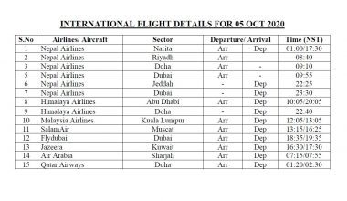 Tribhuvan International Airport, Kathmandu has issued a press release today stating the International flight details for 3 September 2020.