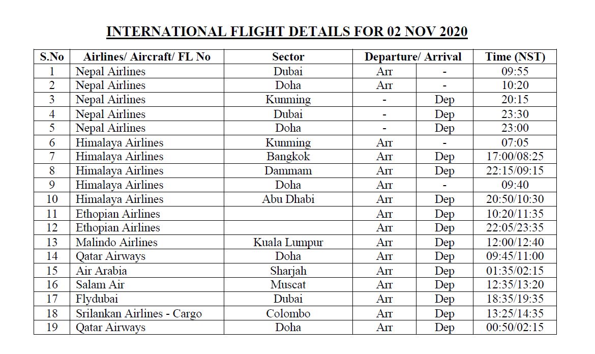 As per the AviationNepal source, The international chartered and regular flights from Tribhuvan International Airport, Kathmandu on 02 November 2020 are as described. The carriers involved might adjust the timing mentioned below. For exact dates and times, immediately ask the travel agencies / concerned airlines. The data below is for informational purposes only.