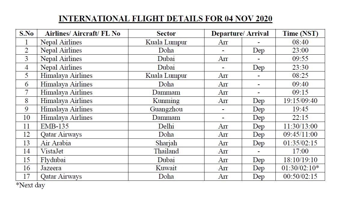 As per the AviationNepal source, The international chartered and regular flights from Tribhuvan International Airport, Kathmandu on 04 November 2020 are as described. The carriers involved might adjust the timing mentioned below. For exact dates and times, immediately ask the travel agencies / concerned airlines. The data below is for informational purposes only.