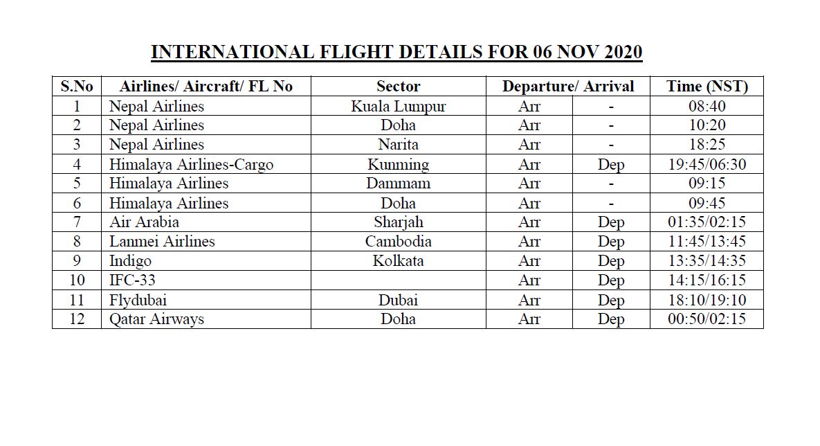 As per the AviationNepal source, The international chartered and regular flights from Tribhuvan International Airport, Kathmandu on 06 November 2020 are as described. The carriers involved might adjust the timing mentioned below. For exact dates and times, immediately ask the travel agencies / concerned airlines. The data below is for informational purposes only.
