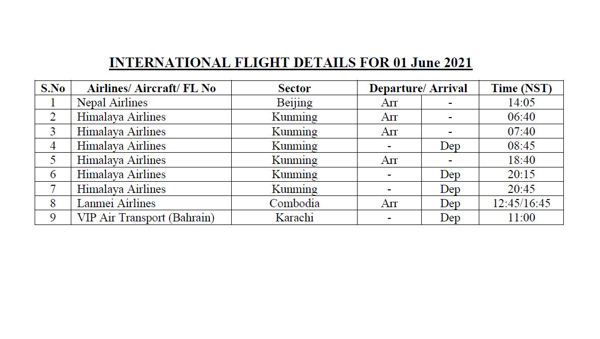 As per the AviationNepal source, The international chartered and regular flights from Tribhuvan International Airport, Kathmandu on 1 June 2021 are as described. The carriers involved might adjust the timing mentioned below. For exact dates and times, immediately ask the travel agencies / concerned airlines. The data below is for informational purposes only.