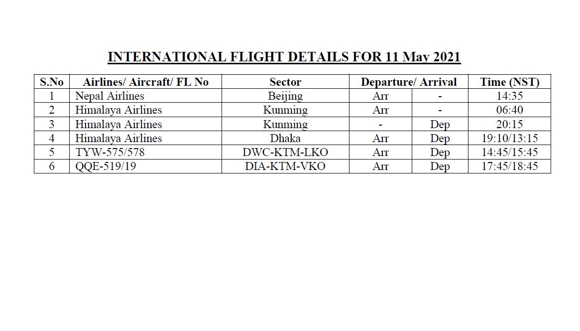 As per the AviationNepal source, The international chartered and regular flights from Tribhuvan International Airport, Kathmandu on 11 May 2021 are as described. The carriers involved might adjust the timing mentioned below. For exact dates and times, immediately ask the travel agencies / concerned airlines. The data below is for informational purposes only.