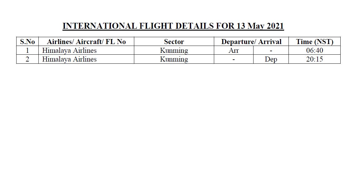 As per the AviationNepal source, The international chartered and regular flights from Tribhuvan International Airport, Kathmandu on 13 May 2021 are as described. The carriers involved might adjust the timing mentioned below. For exact dates and times, immediately ask the travel agencies / concerned airlines. The data below is for informational purposes only.