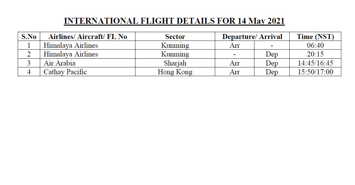 As per the AviationNepal source, The international chartered and regular flights from Tribhuvan International Airport, Kathmandu on 14 May 2021 are as described. The carriers involved might adjust the timing mentioned below. For exact dates and times, immediately ask the travel agencies / concerned airlines. The data below is for informational purposes only.