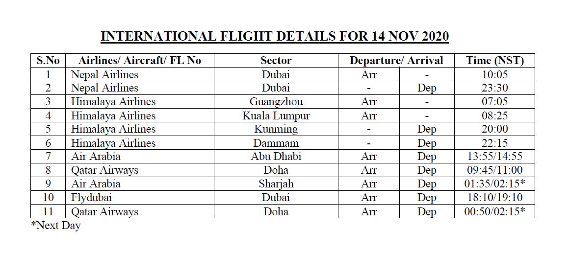 As per the AviationNepal source, The international chartered and regular flights from Tribhuvan International Airport, Kathmandu on 14 November 2020 are as described. The carriers involved might adjust the timing mentioned below. For exact dates and times, immediately ask the travel agencies / concerned airlines. The data below is for informational purposes only.