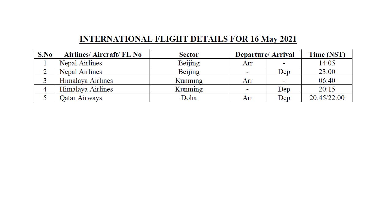 As per the AviationNepal source, The international chartered and regular flights from Tribhuvan International Airport, Kathmandu on 16 May 2021 are as described. The carriers involved might adjust the timing mentioned below. For exact dates and times, immediately ask the travel agencies / concerned airlines. The data below is for informational purposes only.