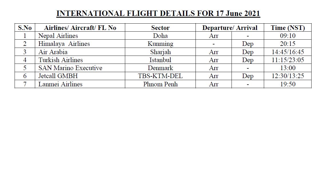As per the AviationNepal source, The international chartered and regular flights fromTribhuvan International Airport, Kathmandu on 17 June 2021 are as described. The carriers involved might adjust the timing mentioned below. For exact dates and times, immediately ask the travel agencies / concerned airlines. The data below is for informational purposes only.