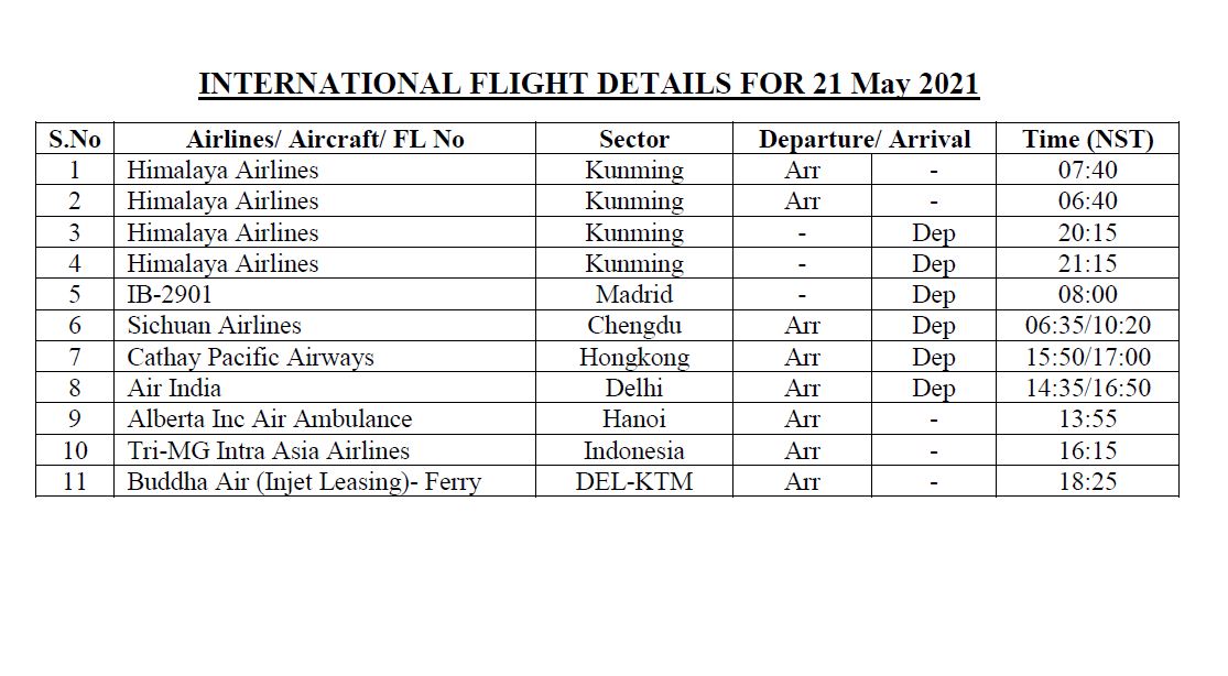 As per the AviationNepal source, The international chartered and regular flights from Tribhuvan International Airport, Kathmandu on 21 May 2021 are as described. The carriers involved might adjust the timing mentioned below. For exact dates and times, immediately ask the travel agencies / concerned airlines. The data below is for informational purposes only.