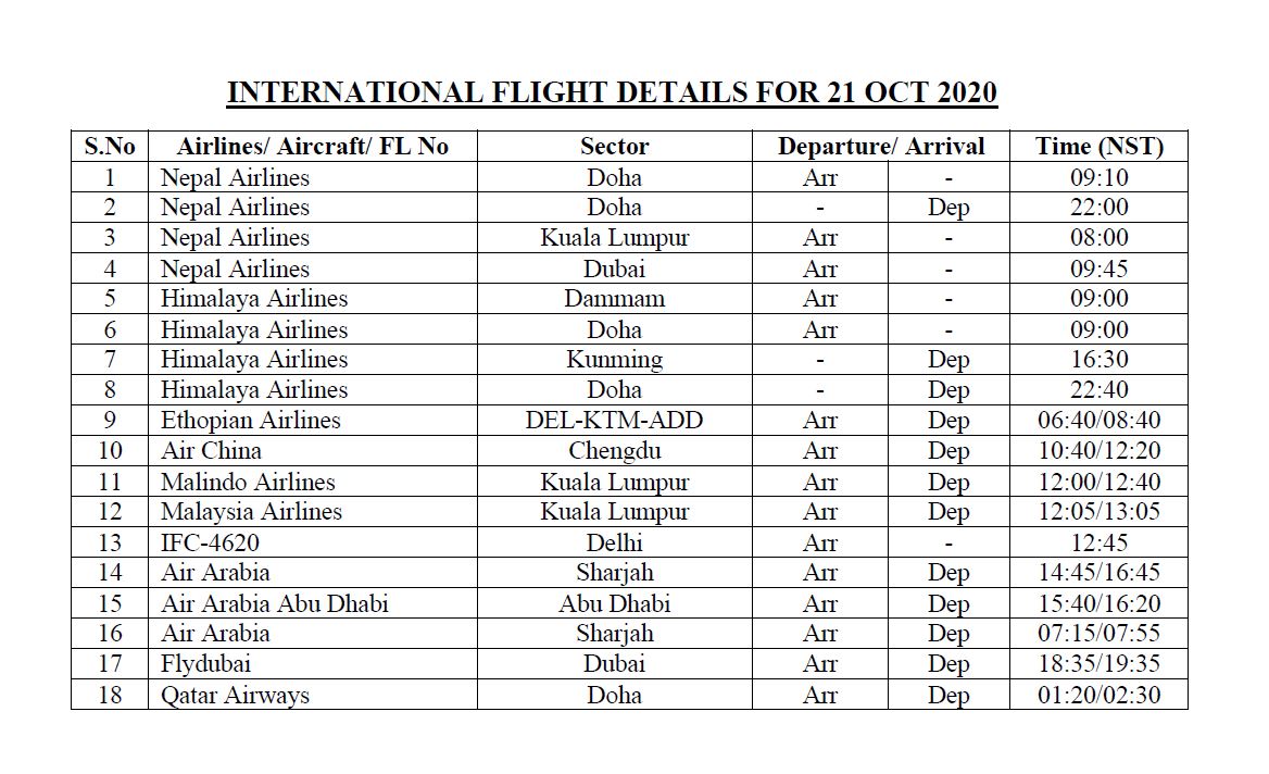 As per the AviationNepal source, The international chartered and regular flights from Tribhuvan International Airport, Kathmandu on 21 October 2020 are as described. The carriers involved might adjust the timing mentioned below. For exact dates and times, immediately ask the travel agencies / concerned airlines. The data below is for informational purposes only.
