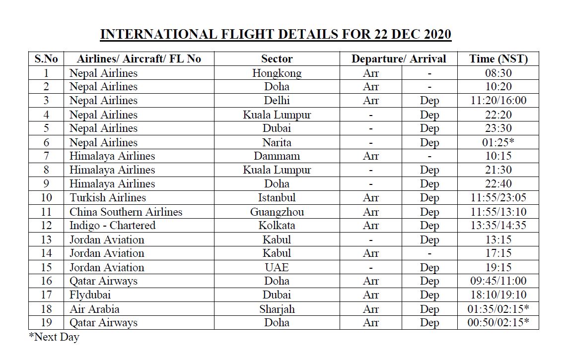 As per the AviationNepal source, The international chartered and regular flights from Tribhuvan International Airport, Kathmandu on 22 December 2020 are as described. The carriers involved might adjust the timing mentioned below. For exact dates and times, immediately ask the travel agencies / concerned airlines. The data below is for informational purposes only.