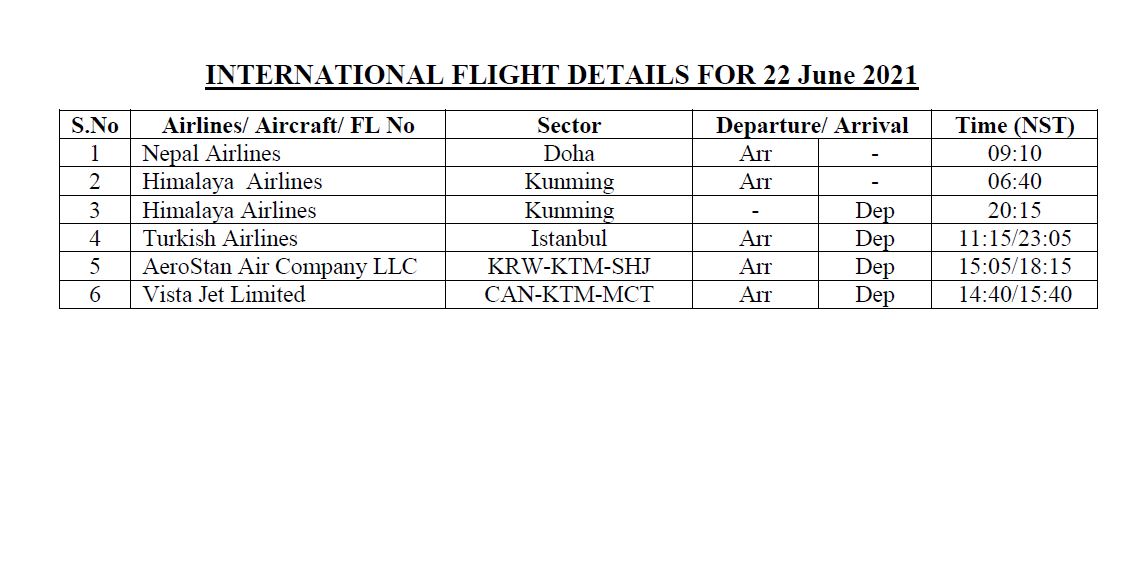 As per the AviationNepal source, The international chartered and regular flights fromTribhuvan International Airport, Kathmandu on 22 June 2021 are as described. The carriers involved might adjust the timing mentioned below. For exact dates and times, immediately ask the travel agencies / concerned airlines. The data below is for informational purposes only.