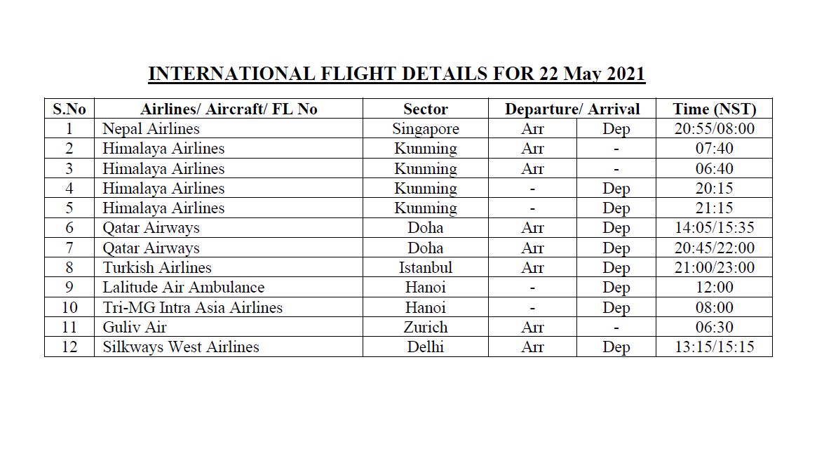 As per the AviationNepal source, The international chartered and regular flights from Tribhuvan International Airport, Kathmandu on 22 May 2021 are as described. The carriers involved might adjust the timing mentioned below. For exact dates and times, immediately ask the travel agencies / concerned airlines. The data below is for informational purposes only.