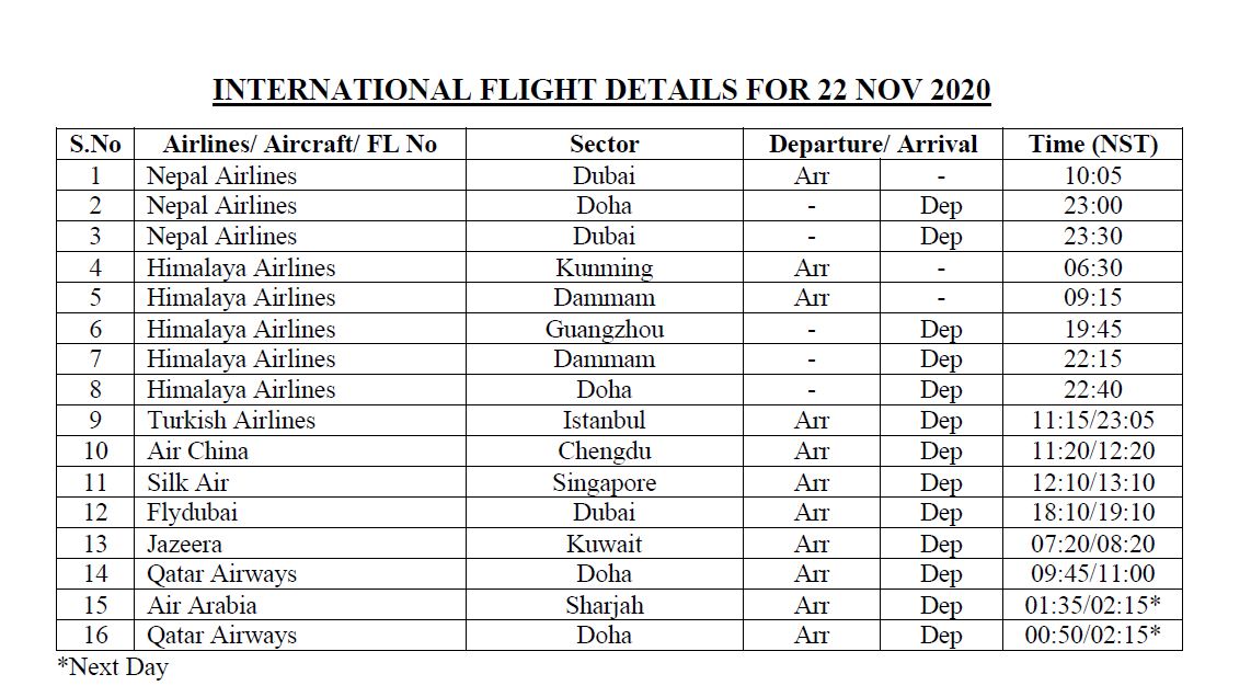 As per the AviationNepal source, The international chartered and regular flights from Tribhuvan International Airport, Kathmandu on 22 November 2020 are as described. The carriers involved might adjust the timing mentioned below. For exact dates and times, immediately ask the travel agencies / concerned airlines. The data below is for informational purposes only.