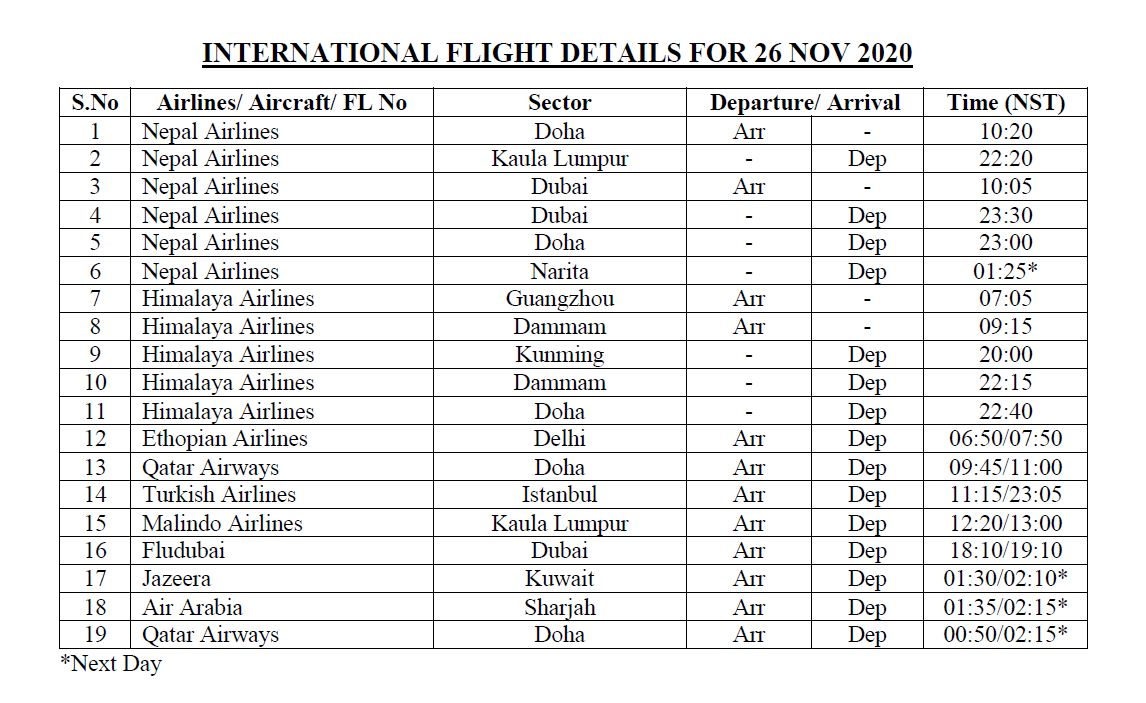As per the AviationNepal source, The international chartered and regular flights from Tribhuvan International Airport, Kathmandu on 26 November 2020 are as described. The carriers involved might adjust the timing mentioned below. For exact dates and times, immediately ask the travel agencies / concerned airlines. The data below is for informational purposes only.