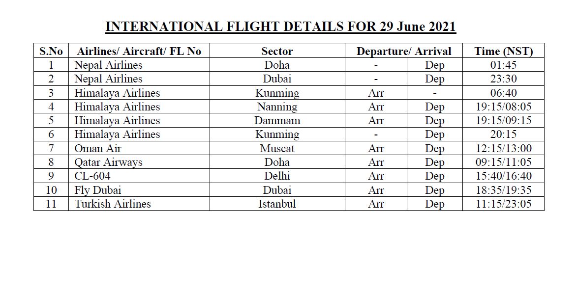 As per the AviationNepal source, The international chartered and regular flights from Tribhuvan International Airport, Kathmandu on 29 June 2021 are as described. The carriers involved might adjust the timing mentioned below. For exact dates and times, immediately ask the travel agencies / concerned airlines. The data below is for informational purposes only.