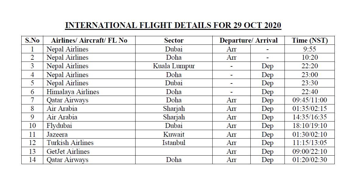 As per the AviationNepal source, The international chartered and regular flights from Tribhuvan International Airport, Kathmandu on 29 October 2020 are as described. The carriers involved might adjust the timing mentioned below. For exact dates and times, immediately ask the travel agencies / concerned airlines. The data below is for informational purposes only.