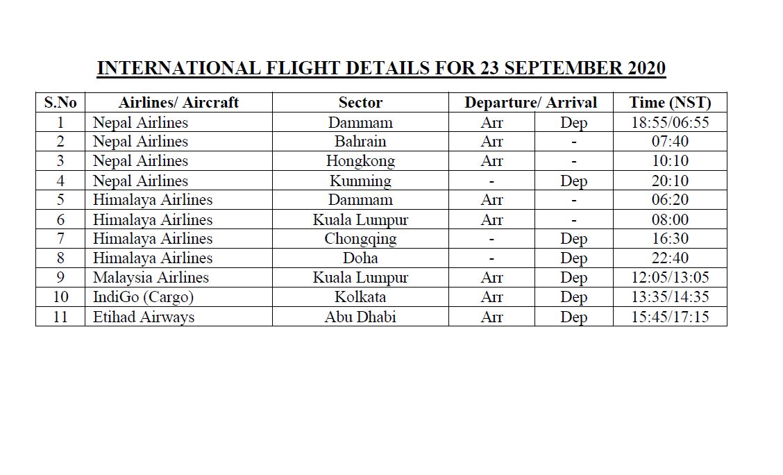 According to the AviationNepal source, the details for the international chartered and regular flights from Tribhuvan International Airport Kathmandu for 23 September 2020 are as follows. Extra flight can be added and time can be revised as per the concerned airlines. Please contact the concerned airlines for more details. The following data are for information purposes only.
