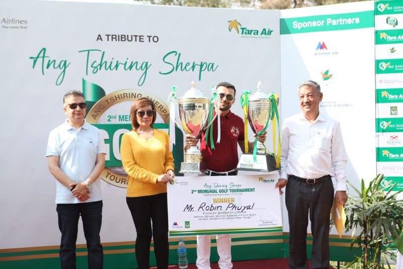 On Saturday, Rabin Phuyal won the Ang Tshiring Sherpa Memorial Golf Tournament here at Gokarna Forest Resort. Overnight leader Phuyal — playing with 17 handicaps– scored 43 points to clinch the trophy and breakfast for four people at Yeti Mountain Home Kongde, including a helicopter ride on Altitude Air.