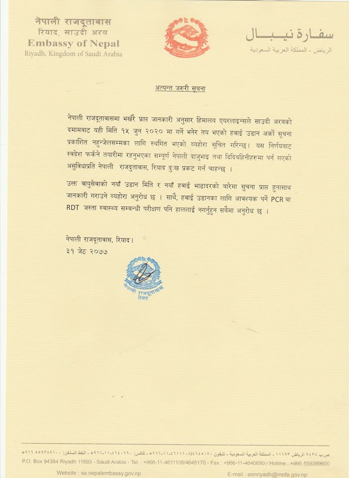 On the other side, The flight of Himalayan Airlines for Saudi Arabia scheduled for June 15 has been also postponed. According to the embassy, new flight schedule along with the new airfare will published soon. In this time embassy has requested not to do any health related tests like PCR or RDT until further notice published.